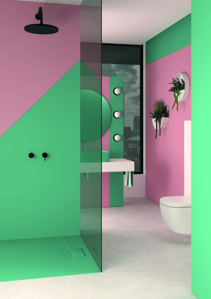 In diesem Beispiel zeigen wir die maßgefertigten Space-Wandpaneele in den Ausführungen Glatt und RAL 6034 sowie RAL 3015 in Kombination mit dem Radiance-Duschboard, ebenfalls in Glatt und RAL 6034. Ein kreatives und poppiges Konzept für den alternativen Geschmack, das sich durch den ganzen Raum zieht, in dem mehrere Space-Wandpaneele, ein Emotion-Waschtisch in RAL 6034 und ein Energy-Waschtisch mit Schürze in glatter Ausführung in der Farbe Pure White zu sehen sind, welcher zum WC -Deco Tulip passt.