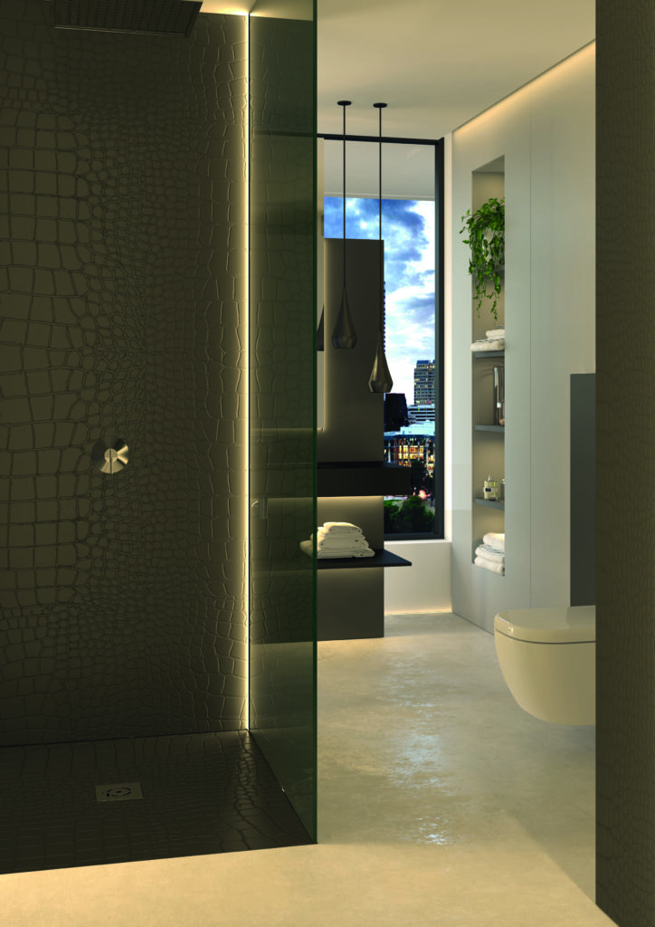 Das Wandpaneel Space mit Krokodilhautprägung und in der Farbe Anthrazit, kombiniert mit dem Duschboard Relief Plus in derselben Farbe und Struktur. Eine originelle und raffinierte Note für ein exklusives Badezimmer.