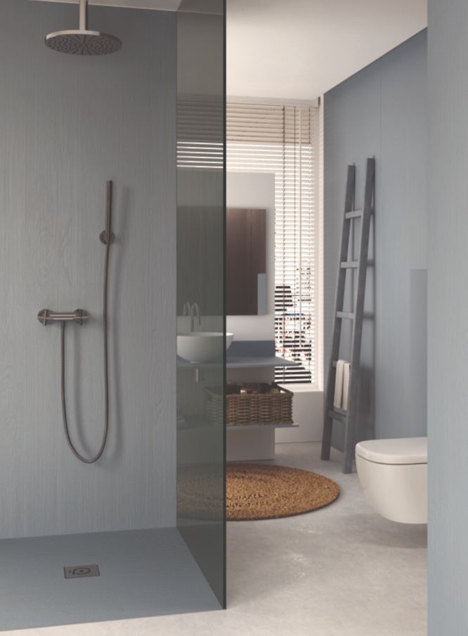 Wenn Sie ein Space-Wandpaneel in der gleichen Struktur und Farbe wie eines unserer Quare-Duschboards wählen, schaffen Sie einen harmonischen und einheitlichen Raum in Ihrem Badezimmer.